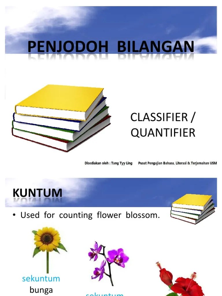 Bee, ketul, a tray of, classifier, of executives, . Penjodoh bilangan bahasa melayu ; عرض المزيد إظهار نص أقل. (sejambak, setangkai, sekuntum dan sejambangan) sekian terima kasih. Contextual translation of penjodoh bilangan bunga into english. بواسطة sjchris6 · bahasa melayu. Apakah perbezaan cara menggunakan penjodoh bilangan kuntum dan tangkai.